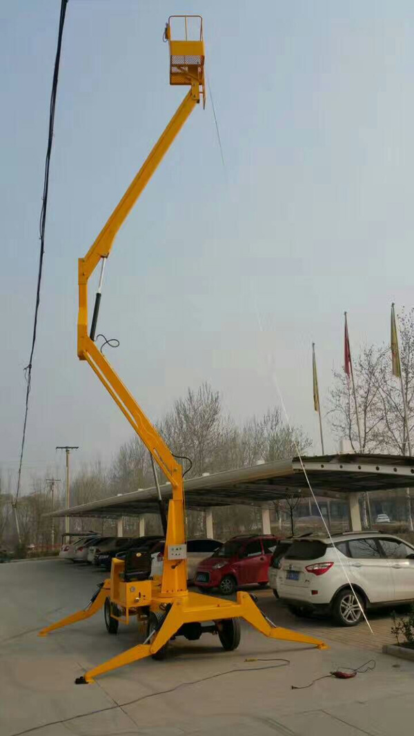 自行曲(折)臂式升降機升高時候是曲折狀態的,升降平臺的結構采用了機電液一體化、可靠性設計和計算機輔助設計等技術,是一種全液壓驅動、自行式專用底盤。突破了以往國內高空作業升降機只能采用汽車或起重機底盤改裝設計的限制。自行曲(折0臂升降機,曲臂式往往體積較小,帶載行駛、作業穩定性好。底盤結構突破了傳統的設計理論和方法,通過優化上車平臺總體布局與載荷分布,減少了重心偏移。采用獨特的大角度后仰式鉸點結構,合理設置多種配重模塊,有效地平衡了工作力矩。采用H型變截面復合箱梁剮性車架和高負荷橡膠輪胎,增加了底盤整體剛度,保證了整機行駛、作業過程的穩定性實現了高空作業升降機帶載行駛的功能。通過大臂前端托架可以快速安裝舉升裝置或載人平臺,實現物料舉升、起重吊裝和載人高空作業等功能同時為擴展作業裝置以及各種工作裝置的快速切換提供了接口。設計的三維旋轉托舉裝置,既能夠自動保持被舉升物料的姿態,又可以實現舉升物料在空間內任意高度、任意位置和任意方向的調整要求,速度控制精確靈敏,微動性能好,滿足了大型洞庫內高空作業與通風管道安裝的要求。