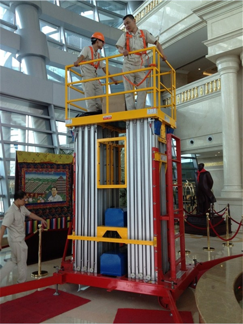 鋁合金升降機系列產品為多為室內型,廣泛適用于星級酒店,大型超市等各行業大廳、廠房內的高空作業,具有升降平衡,操作方便,能進入一般門廳,可隨意進出電梯且耗電少、無污染、工作時不傷地面,可用于貼墻工作及探出作業,工作無死角。鋁合金式液壓升降平臺產品采用鋁合金材料,動力經過液壓泵站帶動鏈條傳動,結構合理設計緊湊。鋁合金升降作業平臺根據升高高度分為單柱、雙住、三柱和四柱式,具有造型美觀、體積小、重量輕、升降平穩等優點,并能夠上下操作,升降平臺廣泛用于酒店賓館、車站候車室、機場候機樓、影劇院、展覽館、體育館等場所,是保養機具、油漆裝修、調換燈具、電器、清潔保養等用途的伴侶。