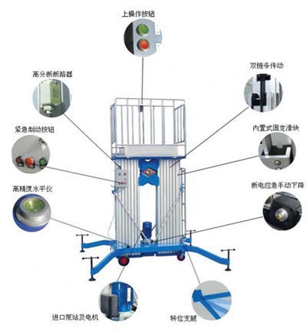 鋁合金升降機系列產(chǎn)品為多為室內(nèi)型,廣泛適用于星級酒店,大型超市等各行業(yè)大廳、廠房內(nèi)的高空作業(yè),具有升降平衡,操作方便,能進入一般門廳,可隨意進出電梯且耗電少、無污染、工作時不傷地面,可用于貼墻工作及探出作業(yè),工作無死角。鋁合金式液壓升降平臺產(chǎn)品采用鋁合金材料,動力經(jīng)過液壓泵站帶動鏈條傳動,結(jié)構(gòu)合理設(shè)計緊湊。鋁合金升降作業(yè)平臺根據(jù)升高高度分為單柱、雙住、三柱和四柱式,具有造型美觀、體積小、重量輕、升降平穩(wěn)等優(yōu)點,并能夠上下操作,升降平臺廣泛用于酒店賓館、車站候車室、機場候機樓、影劇院、展覽館、體育館等場所,是保養(yǎng)機具、油漆裝修、調(diào)換燈具、電器、清潔保養(yǎng)等用途的伴侶。