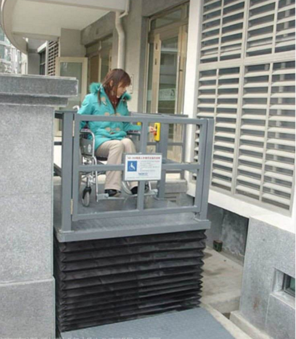 無障礙殘疾人升降機,主要是由導軌和升降平臺板組成的,類似一個簡易的小電梯。導軌是鑲嵌在通道出入口的墻壁上的,隨著樓梯的坡度向下延伸,一直到地道內部。而升降平臺在不使用時可以折疊靠著墻壁放置,這樣不會占用通道出入口處的空間。乘坐輪椅的殘疾人在使用時,輪椅四個輪子可以被固定在臺板上,按動開關后就可以控制升降平臺進入地下通道,安全方便。